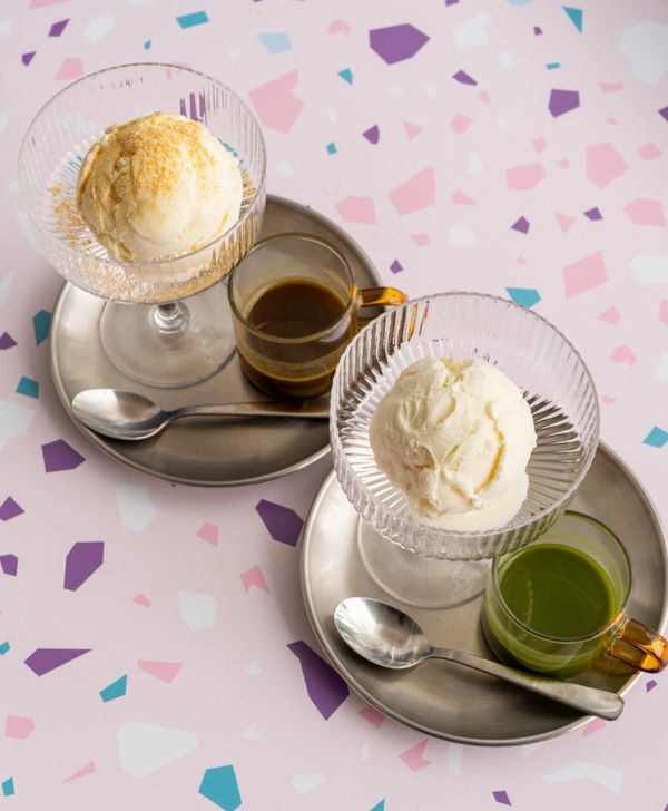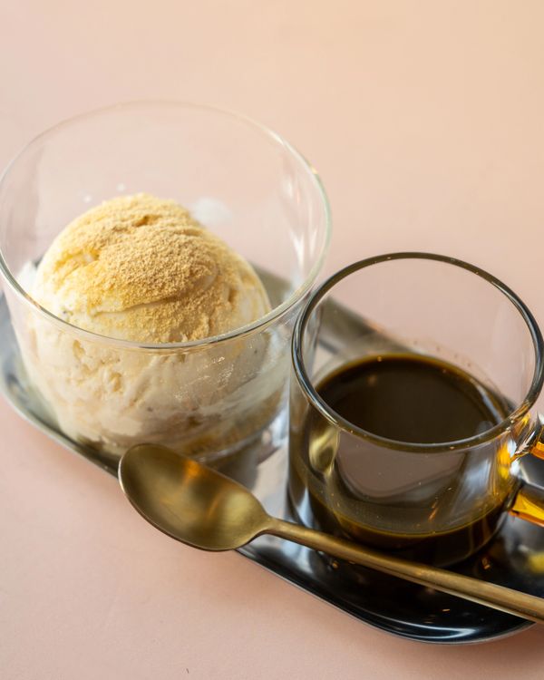 Rocky Point vanilla ice cream top w/ hojicha sauce & kinako powder