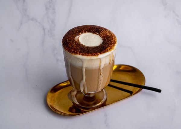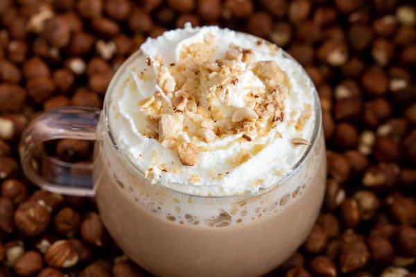 hot/ice - made with real whipping cream, sprinkle with roasted hazelnut bits