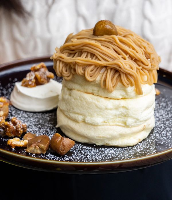 (3) stacked soufflé pancakes, house-made chestnut puree, classic whipped cream, candied walnuts, marrons glacés (candied chestnut), icing sugar