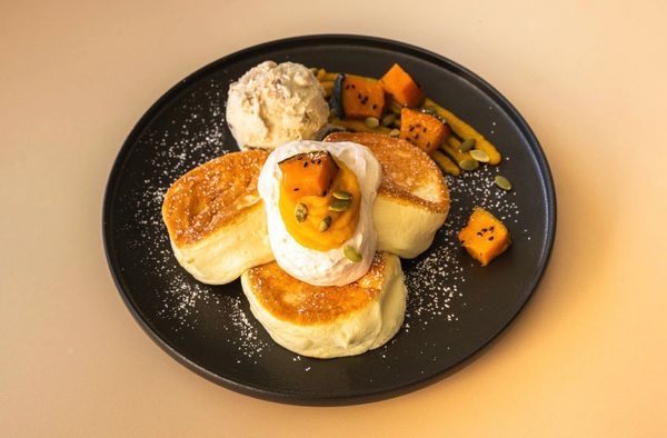 (3) soufflé pancakes, salted caramel whipped cream, house-made kabocha (Japanese pumpkin) puree, honey butter sesame glazed kabocha, roasted pumpkin seed, Rocky Point brown butter pecan ice cream, icing sugar