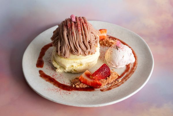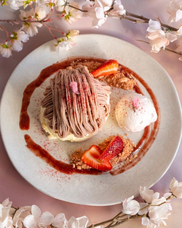 (3) stacked souffle pancakes, sakura-infused whipped cream, sakura mung bean paste, strawberry cookie crumbles, strawberry jam, fresh strawberries, dried sakura petals, strawberry powder.