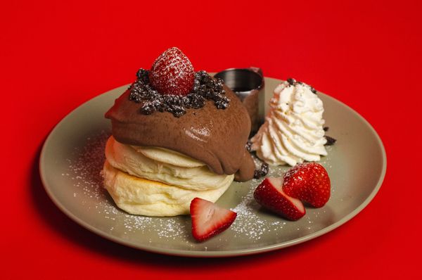 (3) stacked soufflé pancakes, house-made dark chocolate ganache whipped cream, Oreo dark chocolate crunchies, fresh strawberries, Fufu sweet cream, icing sugar